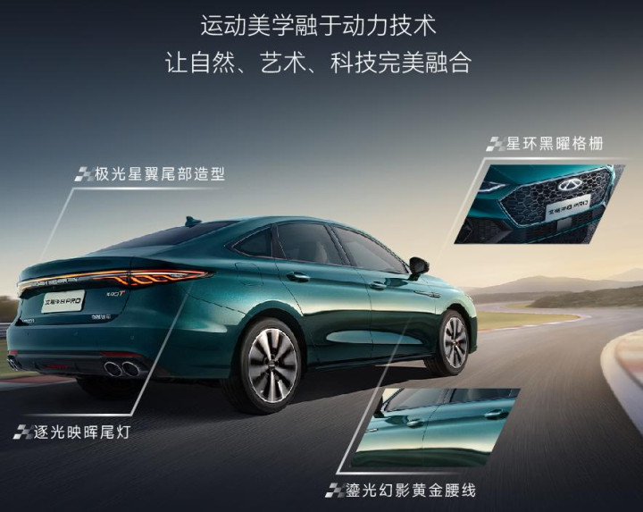 艾瑞泽8 PRO 2.0T在外观设计上大胆创新,采用了锋芒锐动前脸设计,星环黑曜格栅与鎏光幻影黄金腰线交相辉映,营造出强烈的运动气息。车尾部分,贯穿式尾灯组与双边四出真尾排的设计,更是将整车的运动风格推向了高潮。此外,新车还新增了翡翠绿和晶钻灰两款专属车色,满足不同用户的个性化需求。