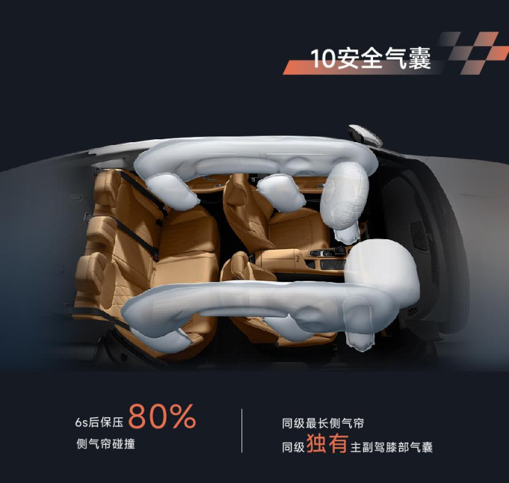 同级独有的10安全气囊、同级最长的1983.7毫米侧气帘,以及300万像素、540°全景影像系统结合达到L2+级别的19项智能驾驶辅助功能,全方位保障行车安全。