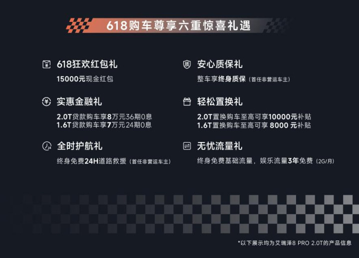 为了助力年轻用户轻松拥有全新奢享出行新体验,艾瑞泽8 PRO 2.0T还带来多重购车权益,包括618狂欢红包礼、实惠金融礼、全时护航礼、安心质保礼、轻松置换礼以及无忧流量礼,全方位满足用户的购车与用车需求。